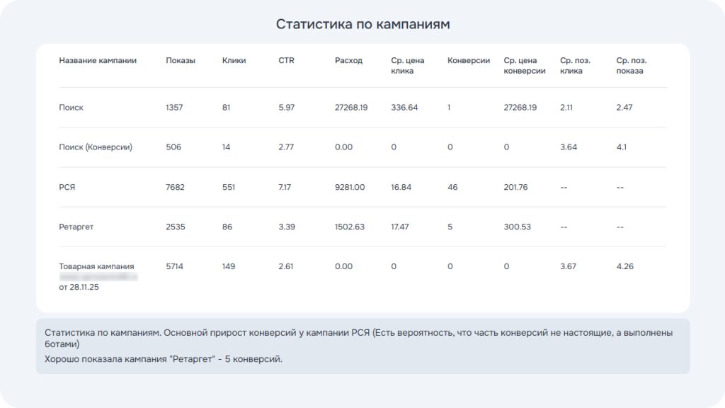Можно написать выводы по кампаниям: что сработало, что подозрительно (например, если конверсии похожи на ботов), что стоит проверить.