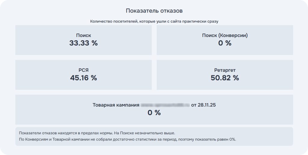 Отдельный блок по отказам в разрезе типов кампаний. И туда же можно добавить пояснение: где отказ является нормой, где стоит насторожиться, где данных недостаточно и показатель условный.