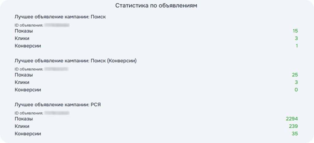 Есть блок по объявлениям: какие объявления лучшие по кампаниям, и сколько они дали показов/кликов/конверсий.