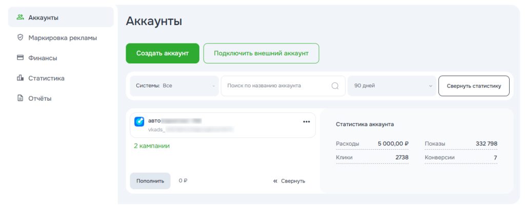 Отчёт формируется сразу в интерфейсе сервиса и всегда отражает актуальное состояние рекламы.