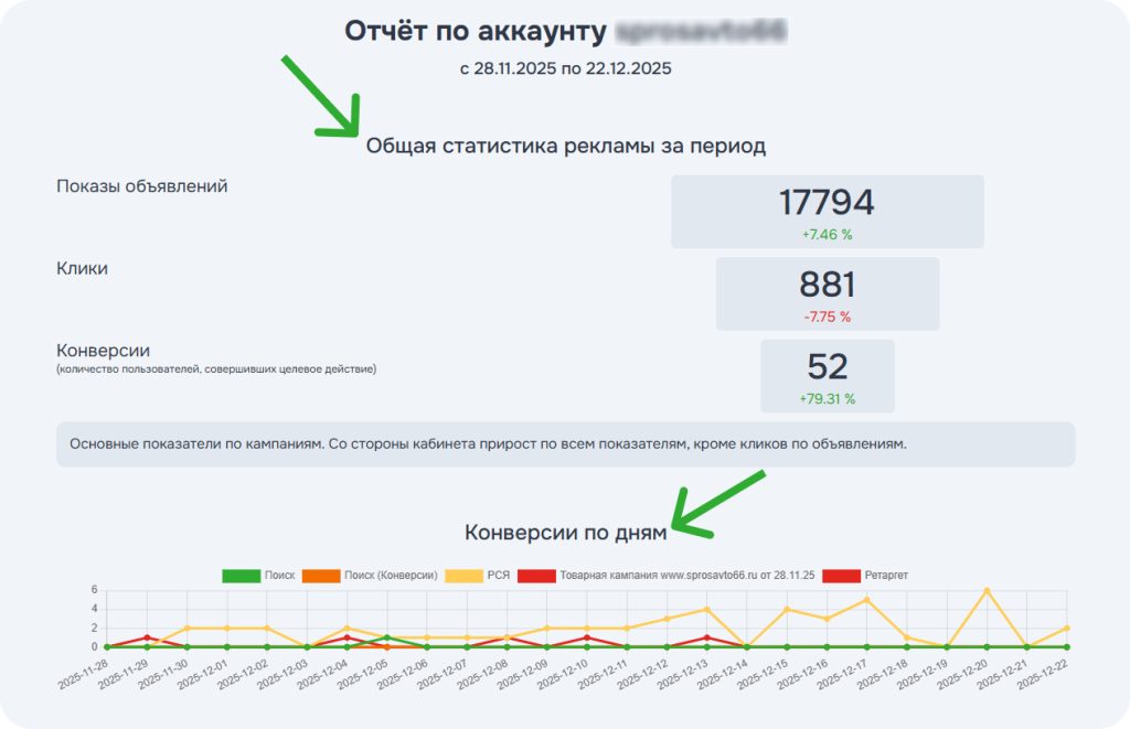 В начале ключевые показатели по аккаунту: показы, клики, конверсии. Плюс динамика относительно прошлого периода (сразу видно, что выросло, а что просело).
