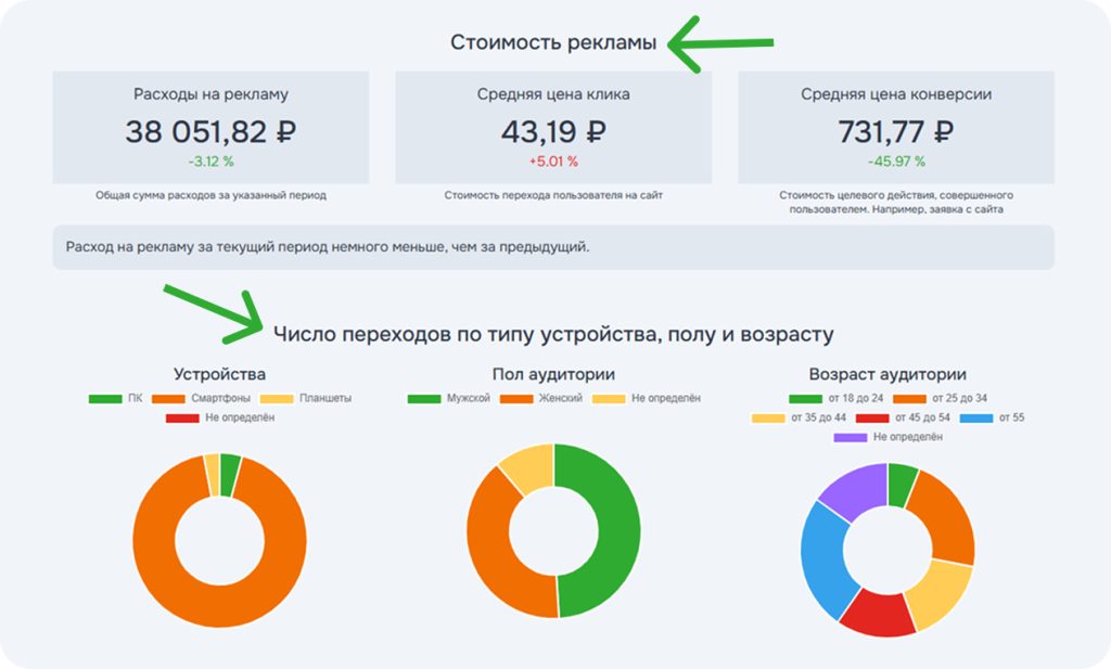 Отдельным блоком показывается стоимость: общий расход, средняя цена клика, средняя цена конверсии и тоже с динамикой к прошлому периоду.