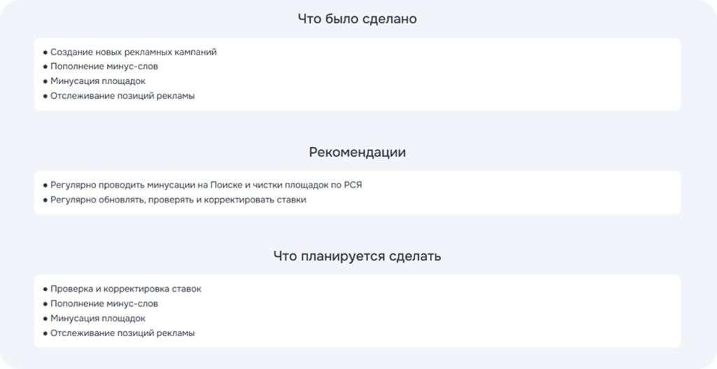 И ещё одна важная часть: в отчёт можно добавить «что было сделано», рекомендации и «что планируется сделать».