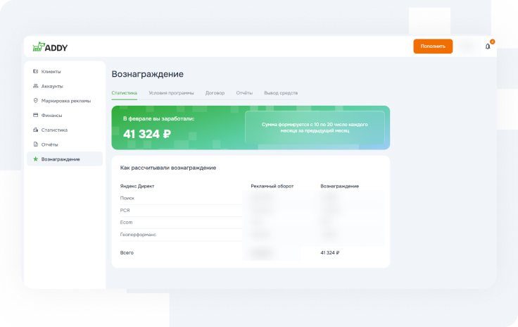 За каждое пополнение рекламных кабинетов через ADDY агентство получает процент обратно. Не бонусами, не условными баллами — живыми деньгами, которые приходят на баланс платформы и которые можно использовать как угодно.