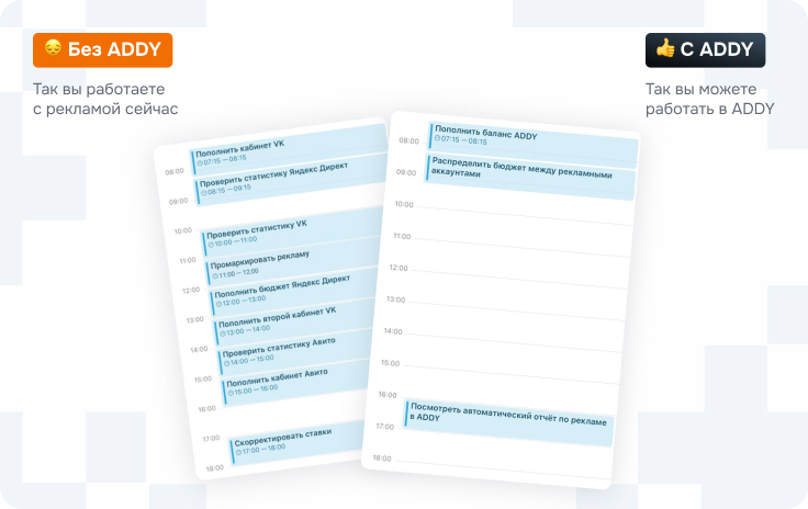 ADDY — это инструмент для тех, кто управляет рекламными кабинетами в Яндекс Директе и VK Рекламе.