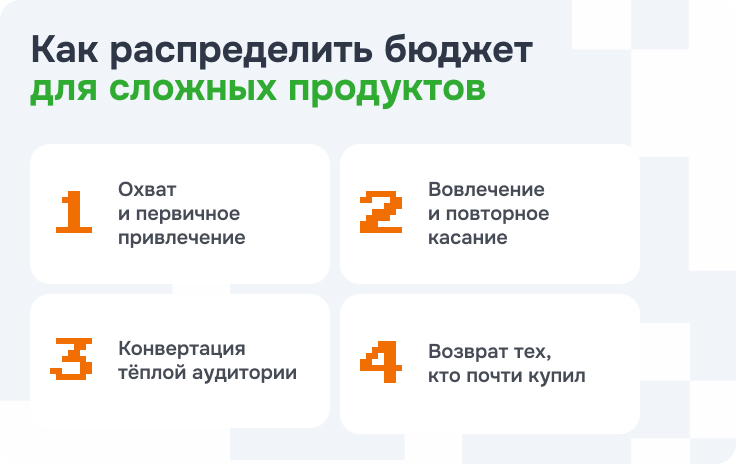 Например, для онлайн-школы или сложной B2B-услуги бессмысленно оценивать рекламу только по первой заявке с холодного трафика. Человек может сначала скачать чек-лист, потом почитать кейс, потом посмотреть вебинар, и только потом оставить заявку. В таких нишах бюджет нужно распределять не просто между “каналами”, а между этапами принятия решения. Иначе вы будете резать те рекламные активности, которые на самом деле подогревают продажу, просто потому что они не дали мгновенной конверсии.