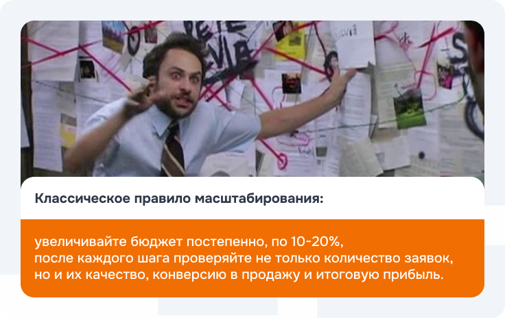 Именно поэтому классическое правило масштабирования звучит так: увеличивайте бюджет постепенно, шагами по 10-20%, и после каждого шага проверяйте не только количество заявок, но и их качество, конверсию в продажу и итоговую прибыль.