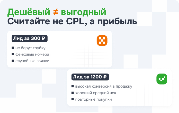 Можно получать заявки по 300 рублей и потом выяснить, что это люди, которые не берут трубку, оставляют фейковые номера, не подходят по бюджету, не понимают продукт или просто случайно оставили заявку, пока листали сайт. Формально CPL красивый, по факту денег с этого нет.