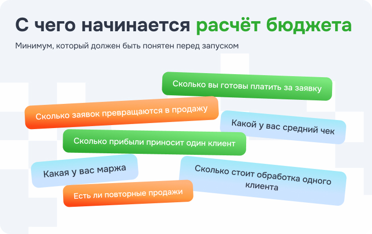 Почему 50? Почему 100? Что именно вы хотите на эти деньги получить? Сколько заявок вам нужно? Какая для вас допустимая стоимость лида? Какая конверсия в продажу? Сколько прибыли приносит один клиент? Если ответов на эти вопросы нет, значит, бюджет определили не на основе расчётов, а просто исходя из суммы, с которой психологически комфортно стартовать. То есть это не расчет, а внутреннее ощущение, сколько денег не страшно потерять.