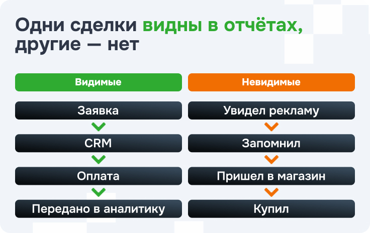 Но часть таких кампаний на деле просто приводит человека к офлайн-покупке, которую аналитика не видит. В результате реклама приносит деньги, а по отчетам выглядит так, будто работает слабо.