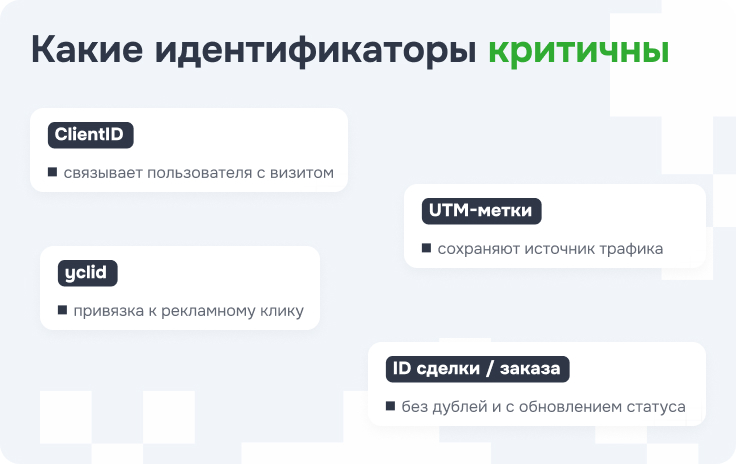 - ID сделки / заказа – чтобы не плодить дубли и обновлять статус одной и той же конверсии.