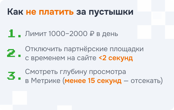 - На 2–3-й день откройте статистику по площадкам. Если Яндекс Директ показывает трафик с партнёрских сайтов с временем на сайте 2 секунды — отключайте их вручную. Если VK Реклама сливает на мобильные игры — ставьте исключения.