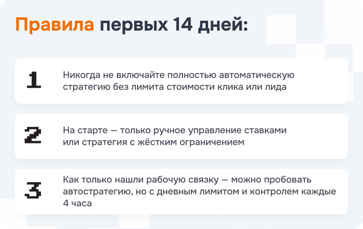 Самое опасное заблуждение: «Я поставлю автоматическую стратегию, система сама найдет лучших клиентов». На практике «Максимум кликов» без лимита цены клика может списать 5000 рублей за час на нецелевых запросах. А «Максимум конверсий» без ограничения стоимости лида будет покупать заявки по 5000 рублей, даже если вы готовы платить только 800.