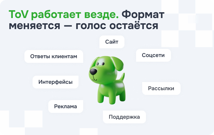 При этом ToV работает сразу во всех каналах. Сайт, соцсети, рассылки, реклама, поддержка, интерфейсы, ответы клиентам – все должно быть в одной логике. Формат может меняться, но голос бренда должен оставаться узнаваемым. Иначе получается какое-то расстройство: в соцсетях бренд шутит и кидает мемы, а в рассылке пишет как пресс-служба.