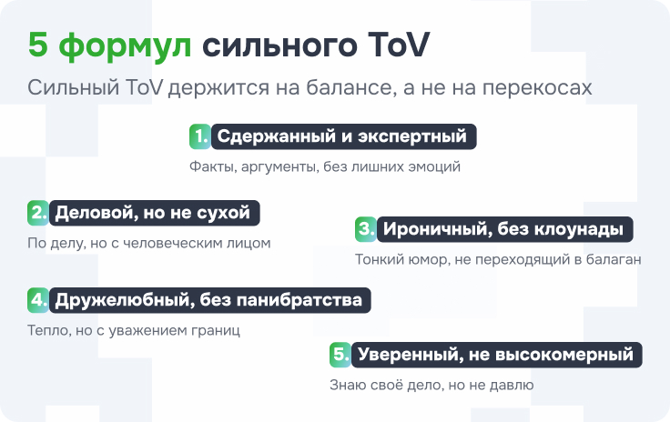 Хороший ToV не обязан дерзить или пытаться понравиться всем сразу. Иногда лучше работает спокойный, понятный и уверенный голос. Главное, чтобы он был точным, живым и узнаваемым.