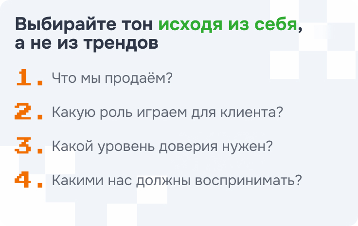Поэтому начинать стоит не с вопроса «как говорит аудитория», а с вопроса «кто мы как бренд».